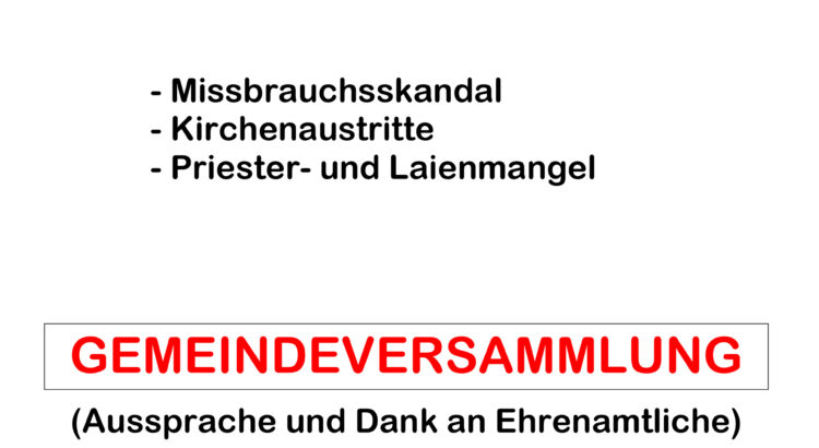 Bereits jetzt wird hingewiesen auf die Gemeindeversammlung am Donnerstag, 3. März, im Anschluss an die Abendmesse in der Pfarrkirche zum Thema: Kirche – wohin ?!